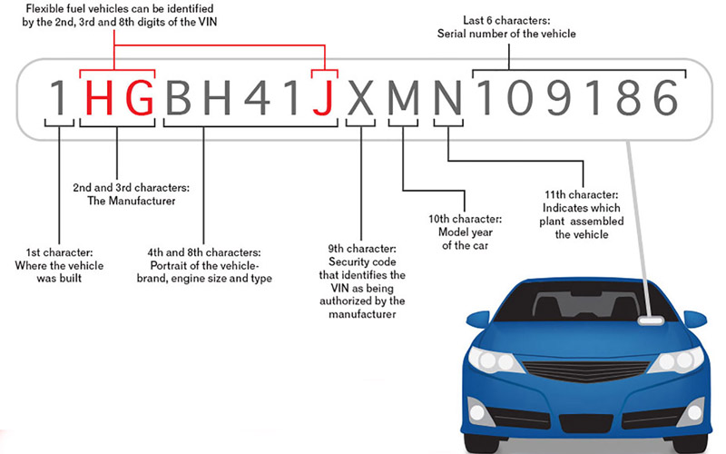شماره 1 که اشاره به نام کشور سازنده دارد. شماره 2 و 3 ، نام کارخانه تولید کننده می باشد. شماره 4 تا 8 به مشخصات کلی خودرو همچون وزن، ابعاد، قدرت موتور و مدل خودرو اشاره دارد. شماره 9 که کد کنترلی خودرو محسوب می شود و توسط کارخانه تعیین می گردد. شماره 10 که مربوط به سال تولید خودرو می باشد. شماره 11 بیانگر کد کارخانه تولید کننده خودرو است. همچنین شماره 12 تا 17 ، شماره شناسایی مخصوص هر خودرو می باشد، توجه داشته باشید که این 6 شماره همیشه عدد هستند.
